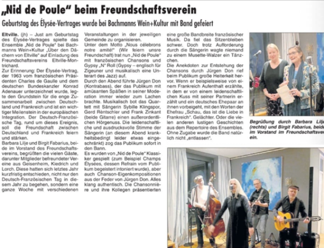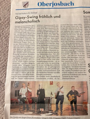 Den Boden für einen fulminanten Musikabend bereitete am Samstag die Formation „Nid de Poule“. Treibende Kontrabasslinien garniert mit virtuosen Gypsyswingsoli – das ist das Markenzeichen der seit 2012 bestehenden Band aus dem Rhein-Main-Gebiet. Frontlady Bille Klingspor, das Gitarristen-Duo Frank Zinkant und Gerd Rentschler sowie Jürgen Dorn am Kontrabass wussten aus ihrem „Hühnernest“ – die deutsche Übersetzung für „Nid de Poule“ – ein wahres Stimmungsfeuer zu entfachen Da hieß es Mitschnippen und Mitklatschen, wenn Klingspor ihre markante Stimme erklingen ließ. Bekannte Titel wie „Temptation“ von Tom Waits, Paul Simons „50 ways to leave your lover“ und die durch Gloria Jones bekannt gewordene Ballade „Tainted Love“, die die Tanzbegeisterung förderten.